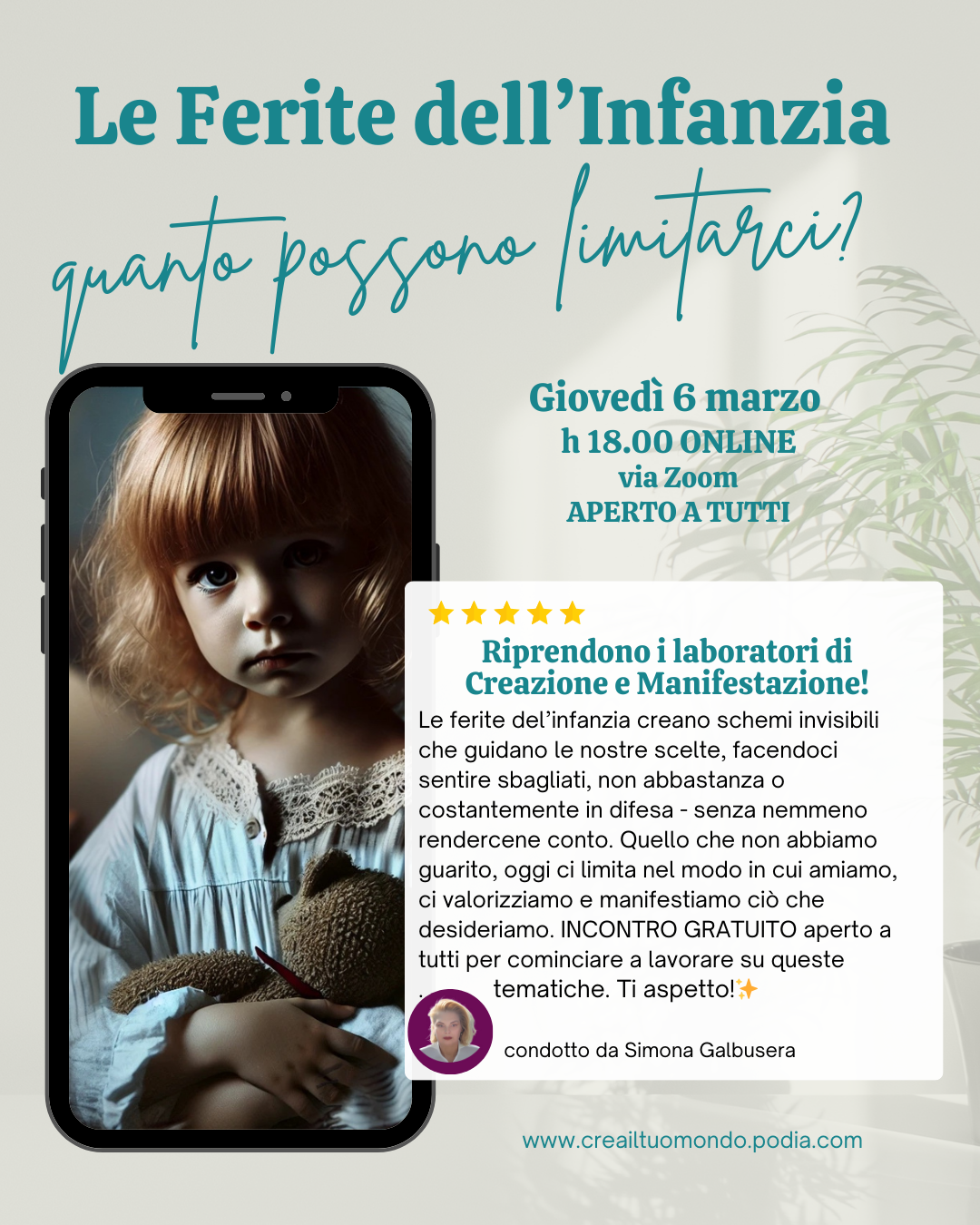 GIOVEDÌ 6 marzo alle h.18.00 ti invito a un incontro gratuito in diretta su Zoom dove inizieremo insieme a esplorare come queste ferite possono bloccarci nella vita di oggi - e come il lavoro energetico può aiutarti a liberarti da quei condizionamenti silenziosi che ancora ti trattengono.