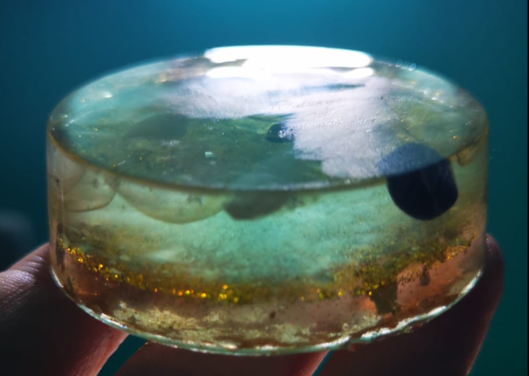 È una matrice che è arrivata all’improvviso che si è trasformata mentre la stavo facendo. Una cosa che si è sentita subito molto forte è stata proprio il suggerimento di incorporare alla ‘ricetta’ (costituita dai vari preparati spagirici e alchemici che sono stati suggeriti perché potesse avere le funzioni che venivano descritte) dei suoi liquidi e della sua resina, venisse anche registrata questa frequenza sonora che insieme alle cariche magnetiche, potesse poi andare a restituirci il tutto, questo insieme di frequenze sotto forma di biorisonanza quando andiamo ad usarla su di noi.